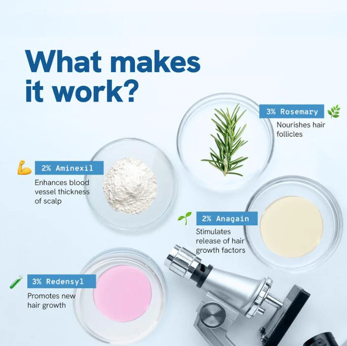 Triple-Action Hair Growth Serum Roll On - 3 % Rosemary, 3 % Redensyl & 2 % Anagain re-activate dormant follicles, boost oxygen delivery and actively block DHT for stronger roots and thicker strands.